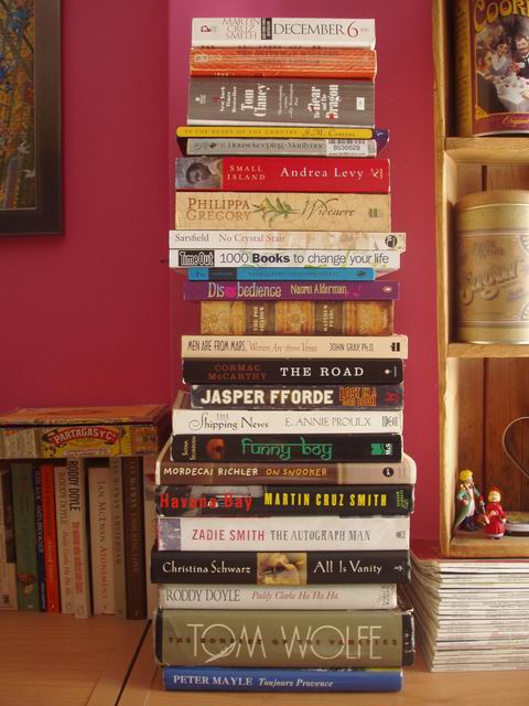 Μετά θ’αρχίσω να διαβάζω ένα ένα τα βιβλία αυτής της τεράστιας στοίβας. Είναι τα βιβλία που μου έφερε η Ασπασία μερικά που πήρα από το Bookcrossing, και μερικά που είχα αγοράσει εγώ και δεν είχα προλάβει να διαβάσω. Για να δούμε πόσο καιρό θα μου πάρει να τα διαβάσω όλα.