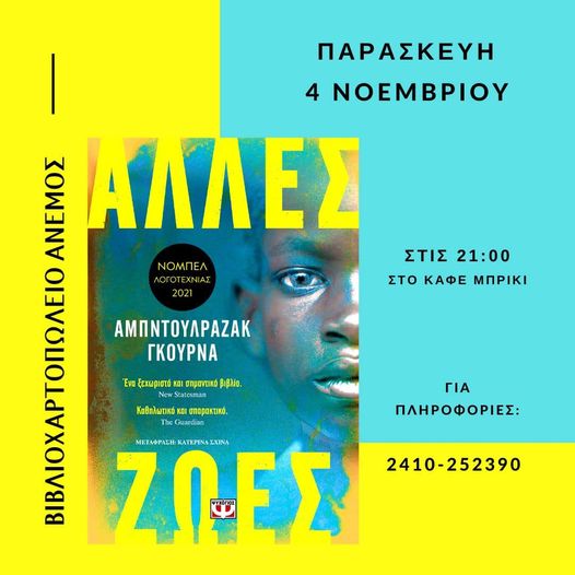 - Λέσχη Ανάγνωσης του Βιβλιοπωλείου Άνεμος: Συνάντηση κάθε μήνα με ένα πολύ πλούσιο λογοτεχνικό ρεπερτόριο. Επόμενη συνάντηση την Πέμπτη 4/11/22 με το βιβλίο του Αμπντουλραζάκ Γκούρνα, Άλλες Ζωές